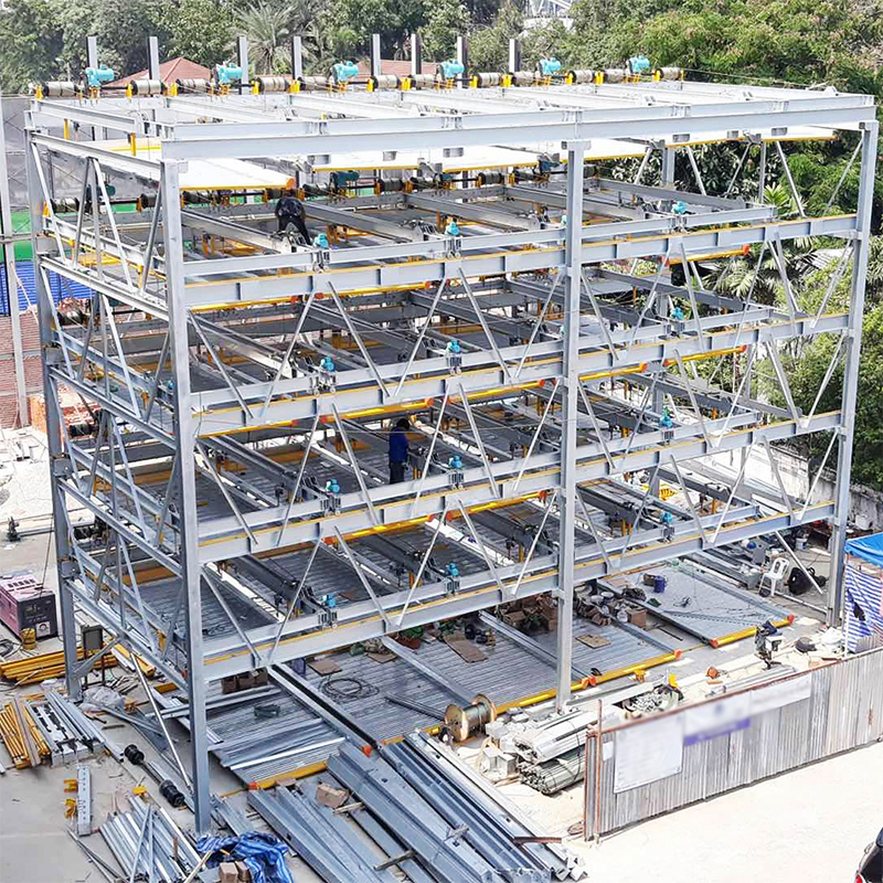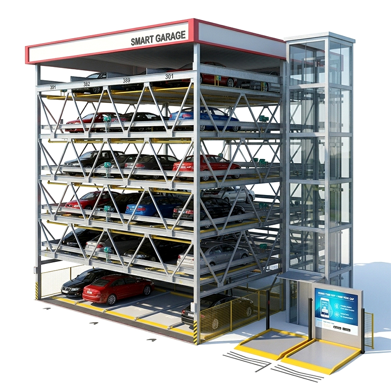 High-efficiency automated car parking system with vertical multi-storey design. Made of durable steel, featuring smart control for rotary parking solutions. Saves space and enhances parking convenience.