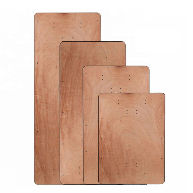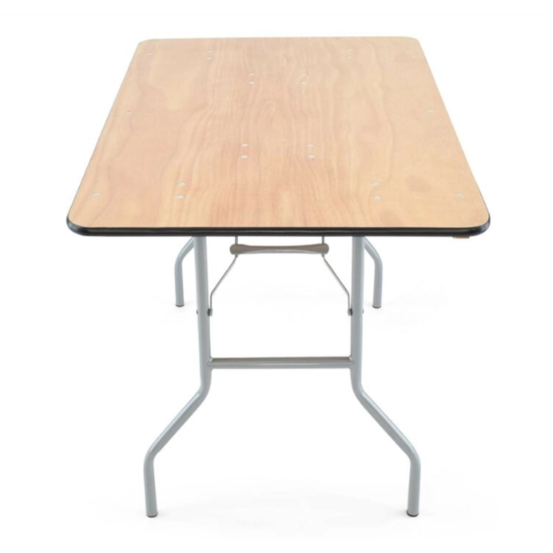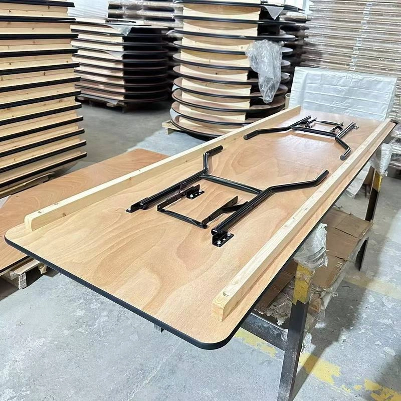 This plywood rectangle long folding table is built for weddings, banquets and parties, with rubber/aluminum edges and metal wishbone legs for sturdiness. Multiple standard sizes available, foldable design for easy storage & transport, ideal for rental companies. Fully customizable for all event needs.
